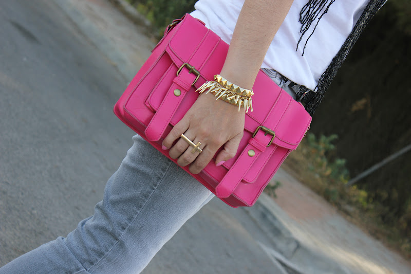 Por lo demás una camiseta básica blanca y unos vaqueros grises y las sandalias negras que les estoy dando mucho uso y para mi son muy cómodas ya que la tira de delante es ancha y me sujeta el pie. Mis nuevas pulseritas de pinchos de Primark y el bolso fucsia que le da un toque de color.