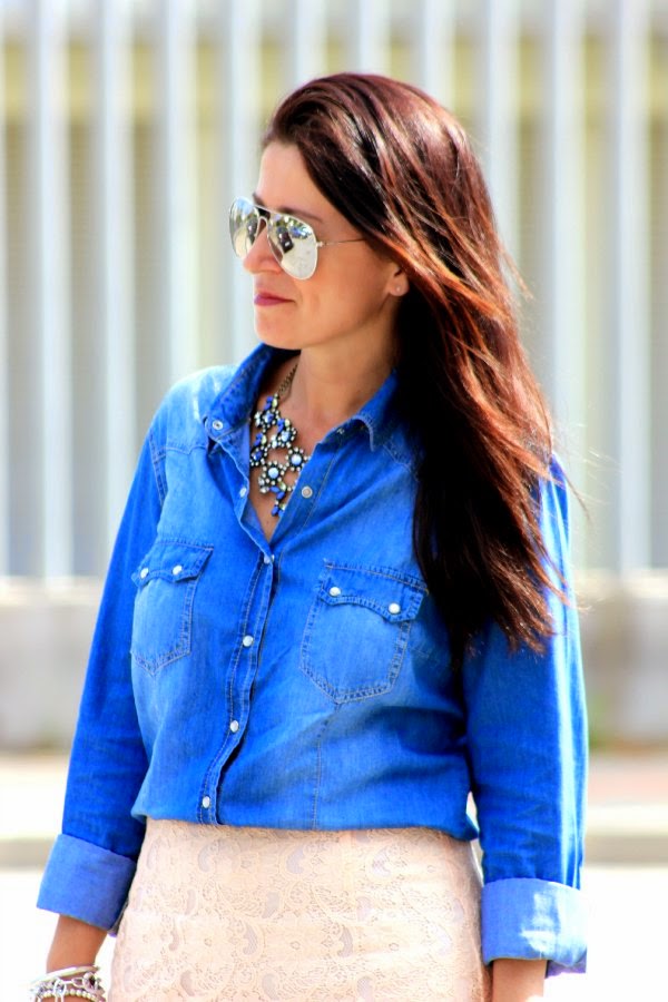 Hola a todos!!!! hoy os enseño esta falda lapiz muy delicada, en tejido de encaje, y para suavizarla y que sea un look más casual y no tan lady la he combinado con la camisa vaquera, un básico de nuestro armario que sigue en auge temporada tras temporada.