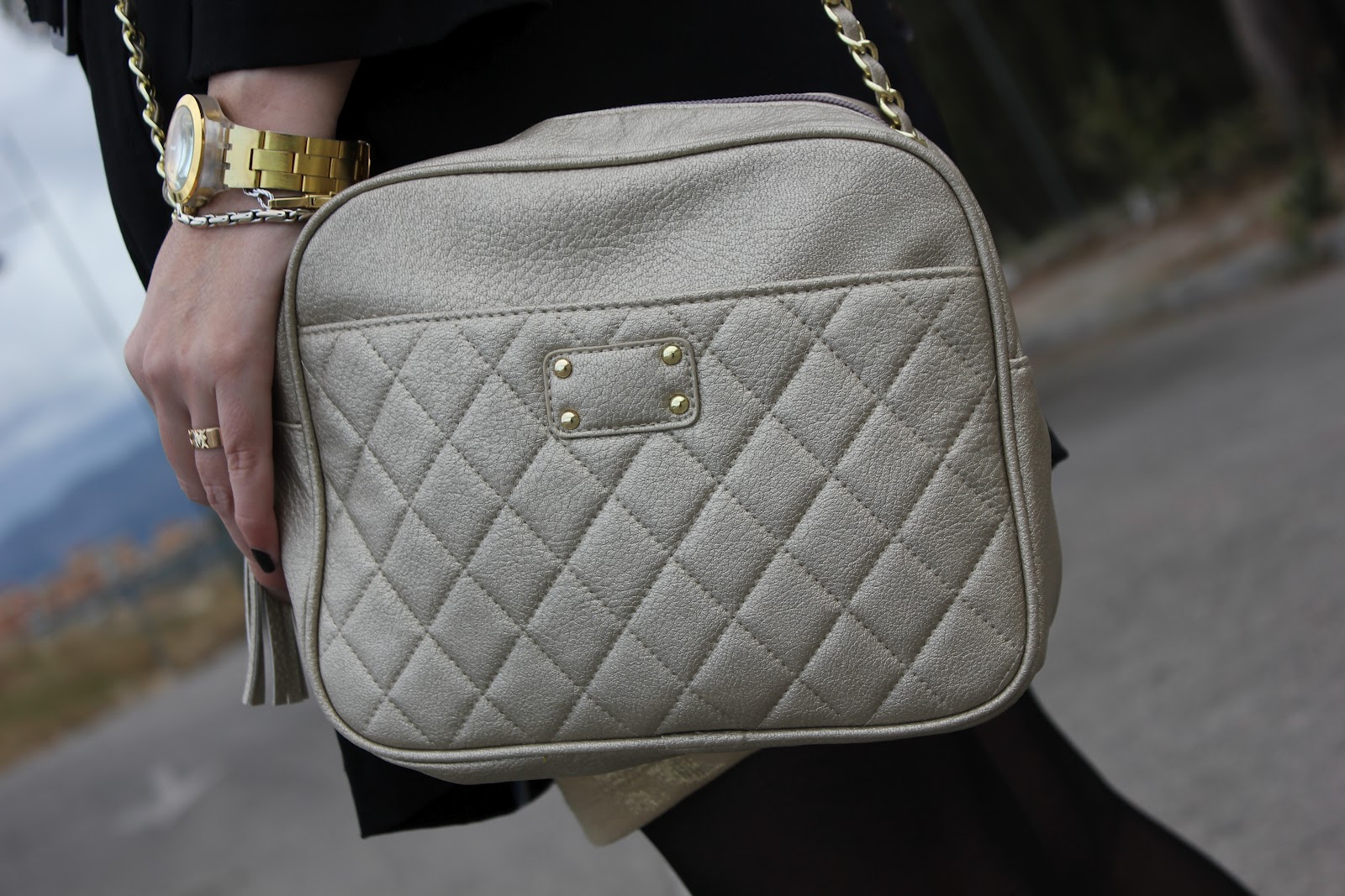 Parece que ha vuelto el invierno, aquí ha estado lloviendo todo el fin de semana, así que he vuelto a ponerme las medias. El dorado ya no es solo para la noche, así que me puse mi falda dorada y la combine con negro, que es un acierto seguro y además para mi es uno de mis colores preferidos. Opte por ponerme un trench, esta vez en negro,para mi esta es una de las prendas que no pueden faltar en nuestro fondo de armario. Y el collar es uno de mis últimos hallazgos del mercadillo, la verdad es que me encanta ir y rebuscar entre sus puestos y a veces se encuentran verdaderas joyas de todo tipo.
